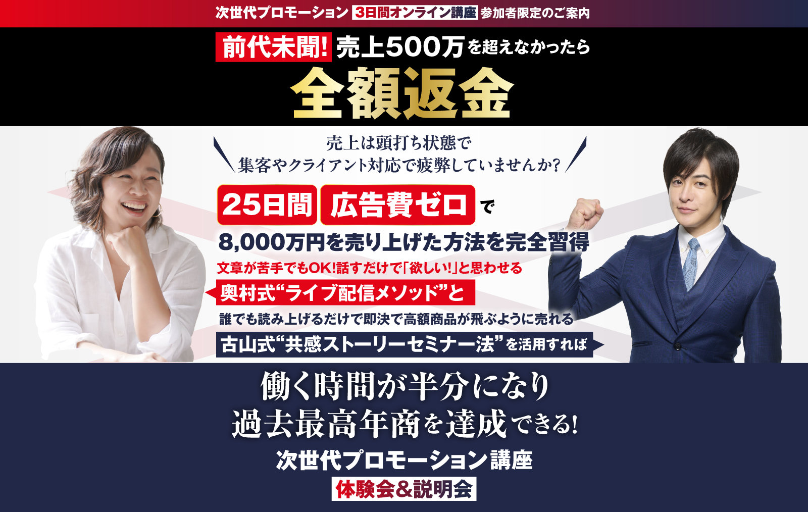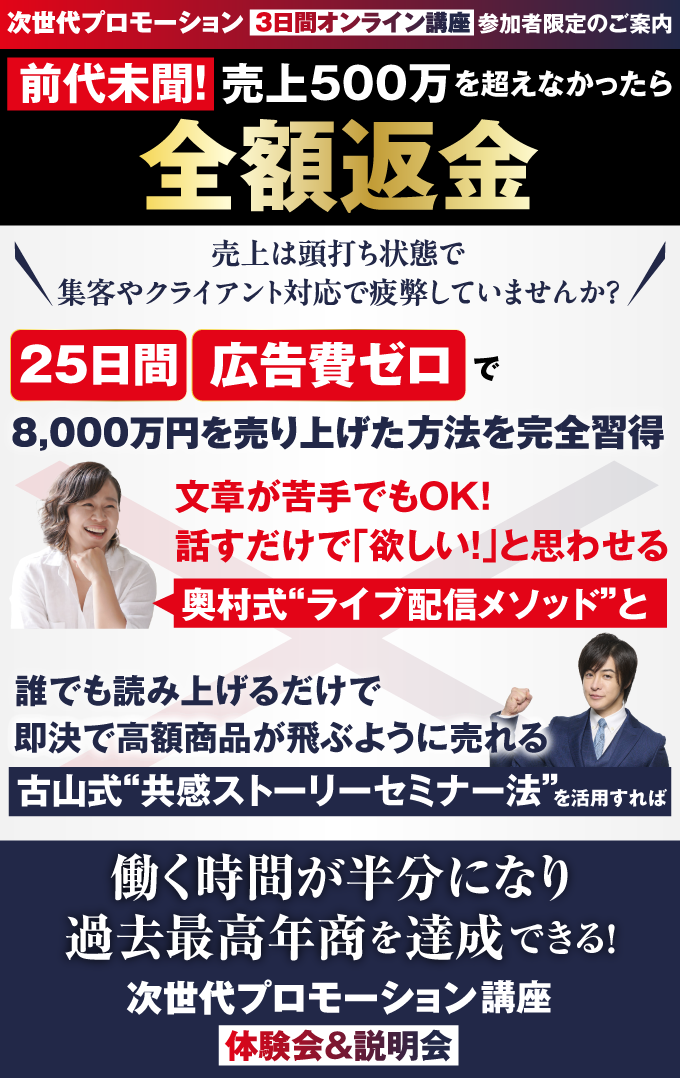 | 備考 | ◆参加条件 年商500万円以上の方 ◆注意事項 ・カメラON、および途中での入退出不可を参加の条件とさせていただきます ・同内容のサービスをすでに提供をしている方、これから予定の方のご参加はご遠慮ください ※また、悪評が世に轟いている方のご参加は固く禁止いたします。にも関わらず、お申込みいただいた場合、恐れ入りますが、弊社より参加お断りのご連絡をさせていただく場合がございますので、その際はご容赦くださいませ。 |